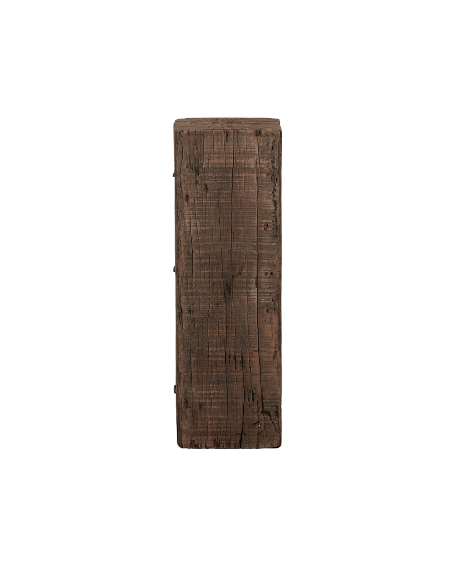Salvaged from a rustic beam, the pedestal’s surface reveals stories trapped in each fissure and provides a connection to the past.