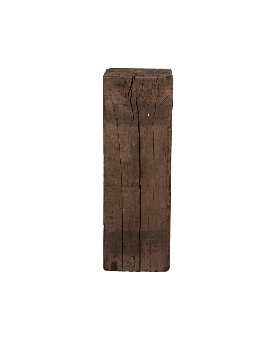 Salvaged from a rustic beam, the pedestal’s surface reveals stories trapped in each fissure and provides a connection to the past.