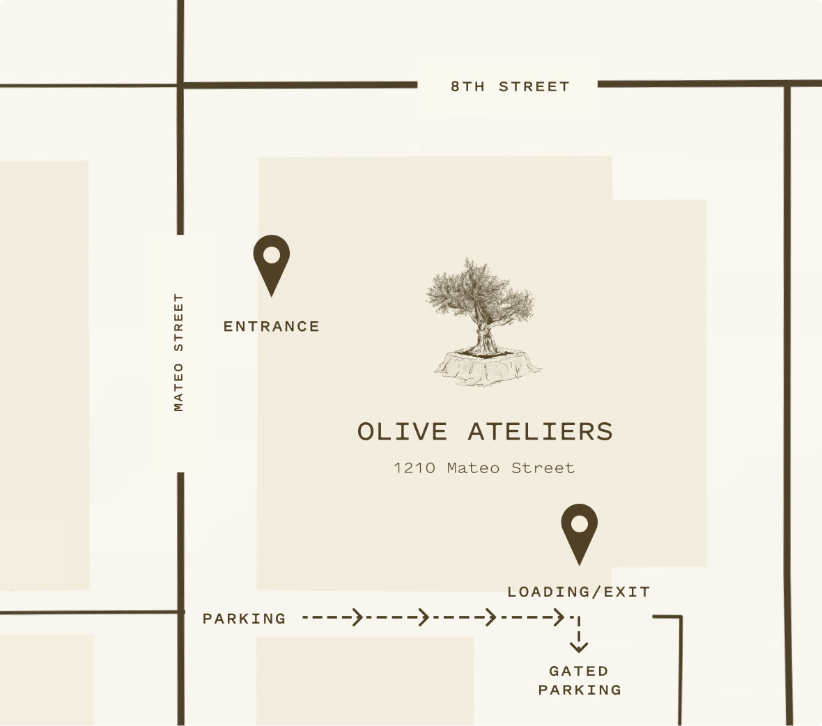Our secure parking lot is located up the alley closest to 1210 Mateo St. Non-metered street parking is available on Mateo, 8th, and other nearby streets.