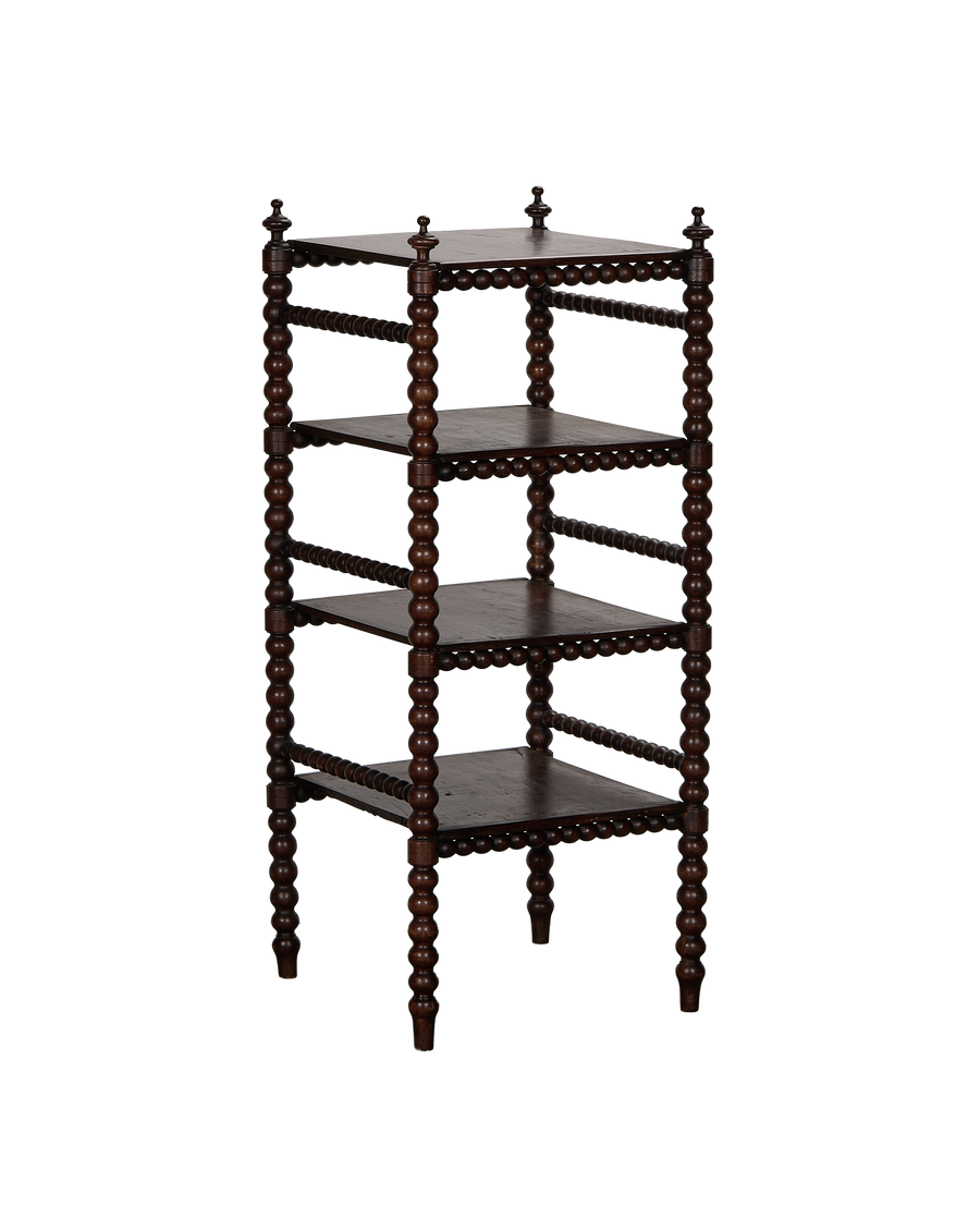 The rich, dark wood lends warmth and depth. The bobbin-turned uprights and bobbin shelf supports highlight the beautiful hand-crafted quality.