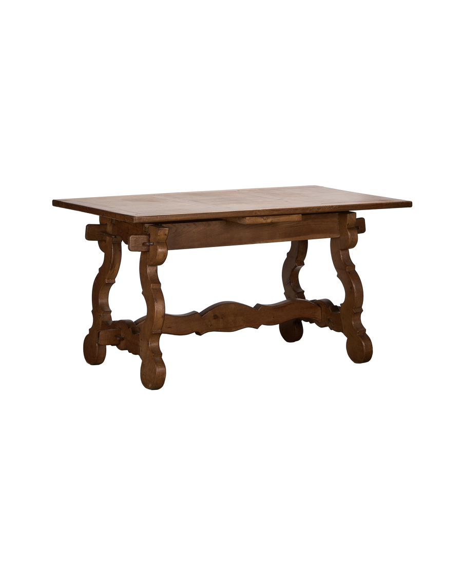 Two hidden leaves pull from either end, offering an expansive surface for entertaining. The carved trestle base and apron suggest heritage craft, adding a sense of collected charm and warmth to a dining space.