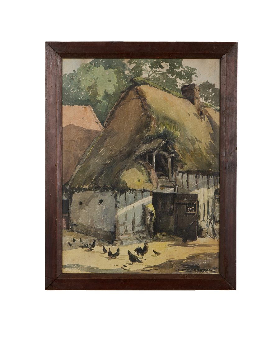 Fowl peck calmly in the foreground, lending natural warmth to the pastoral setting. The entire composition emanates a collected, tranquil feeling, reflecting a simpler heritage. The worn-in wooden frame, with its gentle signs of journey, further enhances the authentic character of this evocative piece.