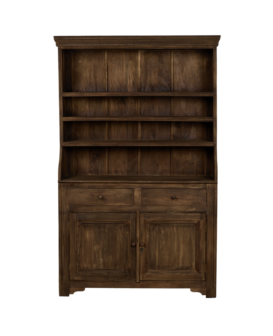 With its elegant profile, the Maisonette Hutch stands as the backbone to any room in your Lieu De Vie. Thoughtfully handcrafted by skilled artisans the detailed cuts in the end grain are rustic but refined. In the joining of the backboards the aging of the wood is in concert with the three upper shelves. Below the pair of drawers rests keyed cupboard doors hiding a single shelf.