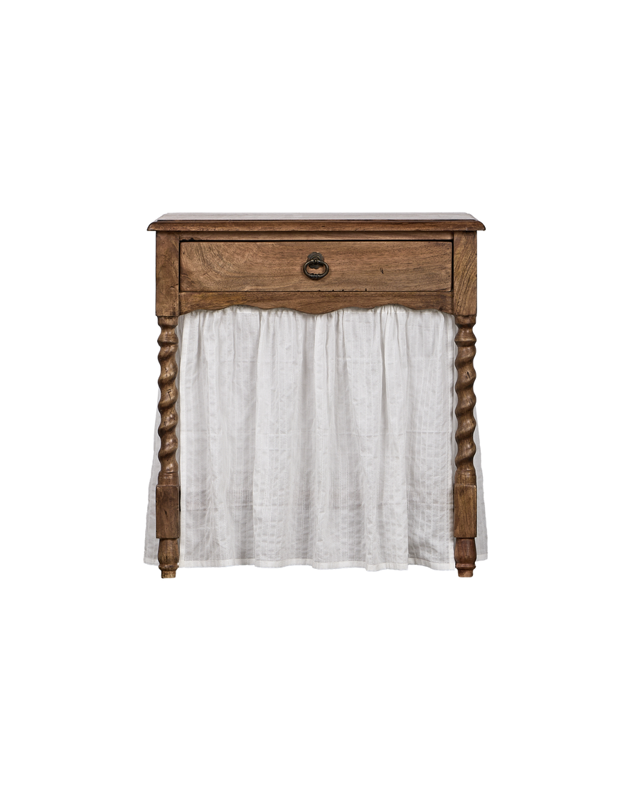 Each Neverland Nightstand is hand-finished by skilled artisans to evoke the nuanced beauty and authentic character of a well-looked-after antique. The cotton dobby curtain is removable.