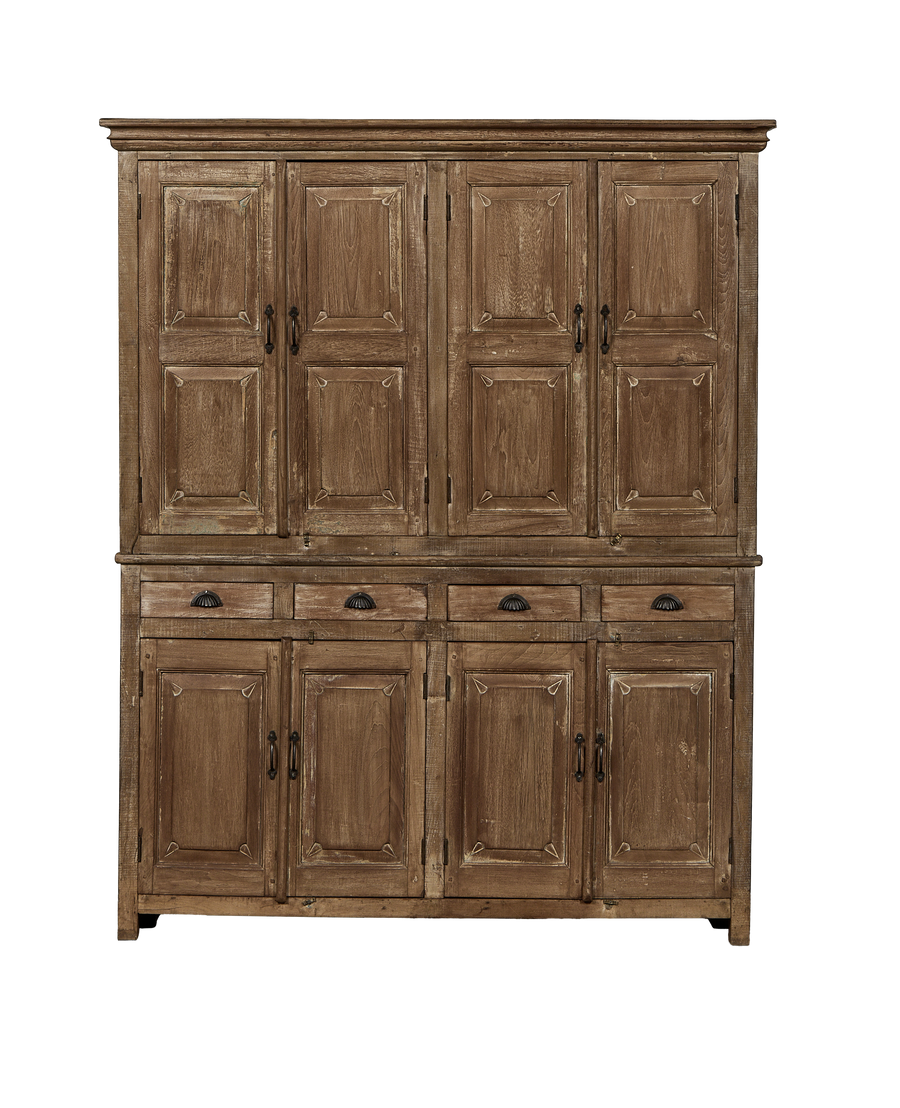 Beneath the drawers, another set of four paneled doors completes the cabinet's stately presence. The careful craft of this heritage piece brings a sense of collected history to any interior, functioning beautifully in a dining room, living space, or study.